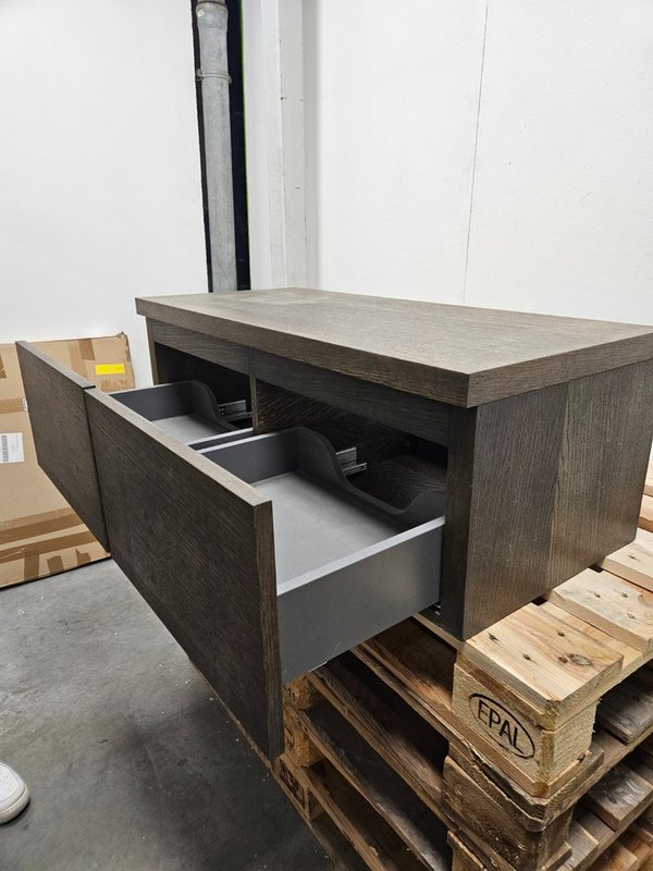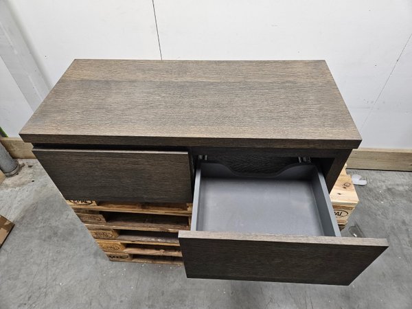 Breng warmte en luxe in je badkamer met dit badmeubel van 100 x 45 cm in een stijlvolle donker houten afwerking. Uitgerust met twee ruime softclose lades, biedt het zowel een strakke look als praktische opbergruimte.