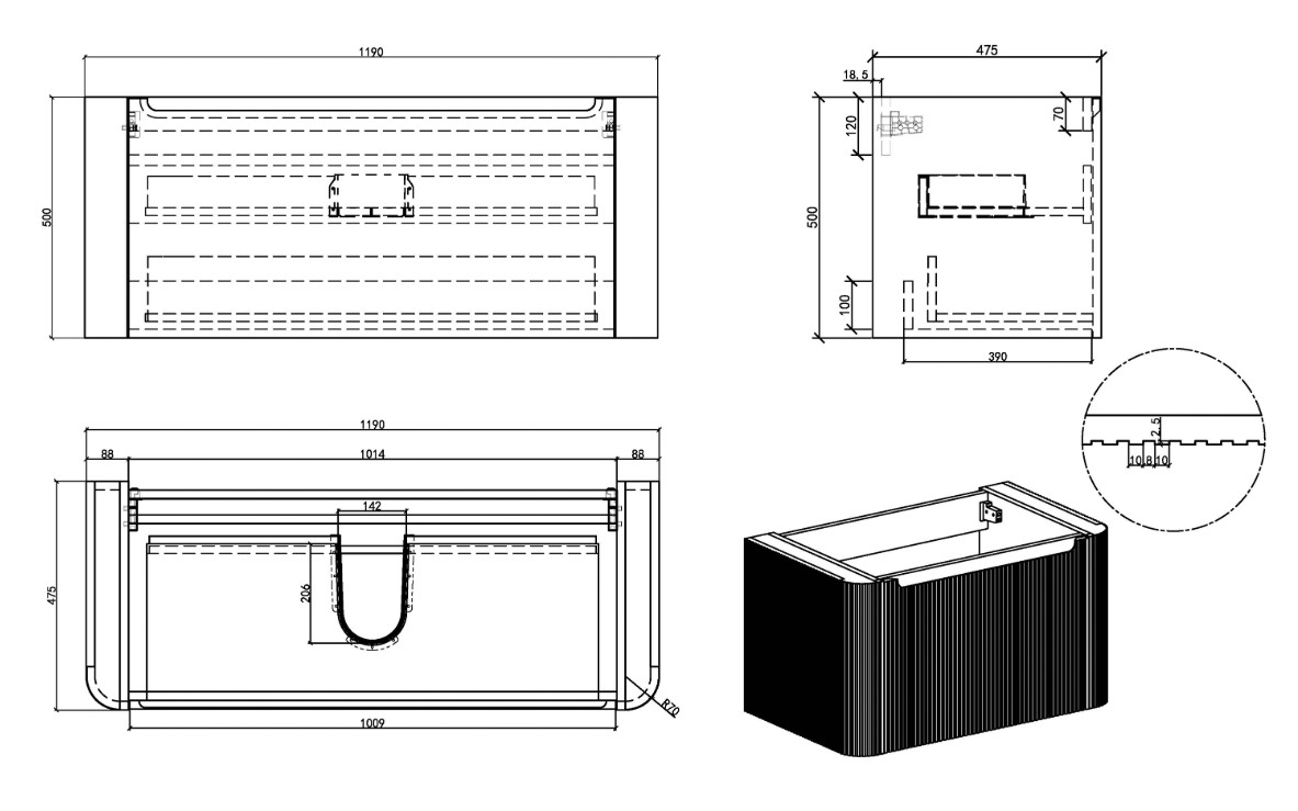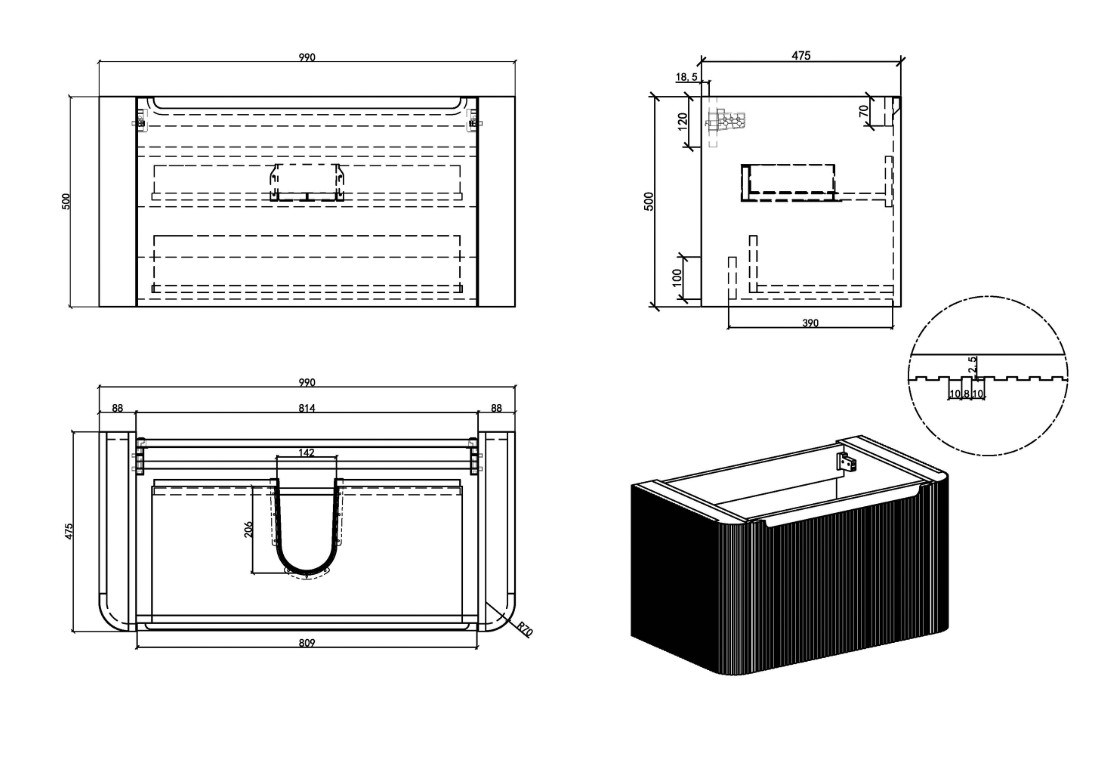De onderkast is voorzien van twee lades, waarvan één verdekt verwerkt voor een minimalistische uitstraling. De hoogwaardige Blum ladegeleiders zorgen voor een soepele werking en zijn uitgerust met softclose, waardoor de lades geruisloos sluiten.