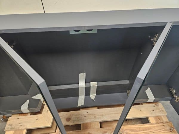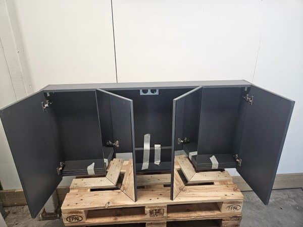 met 4 deuren, ingebouwd stopcontact en aansturing voor een (los te kopen) spiegellampje dat je bovenop de kast kunt monteren. De deuren zijn softclose