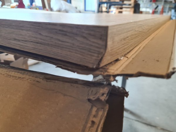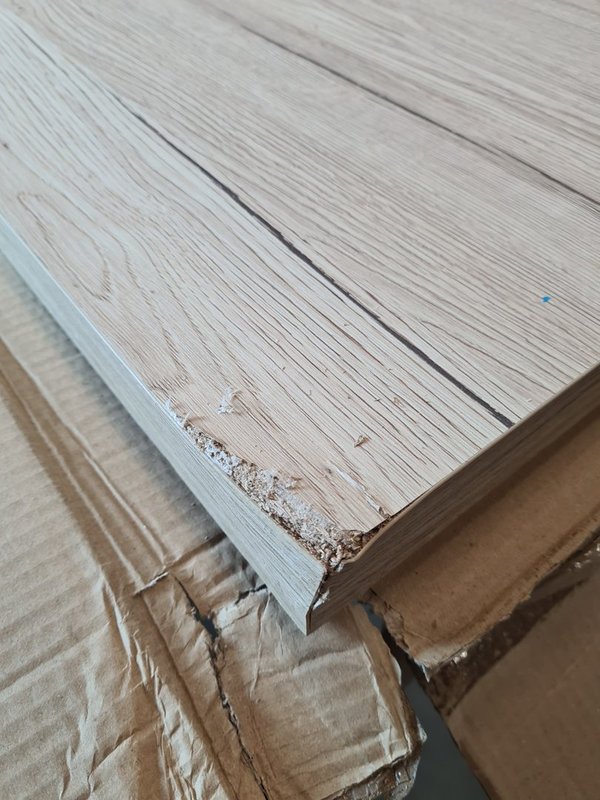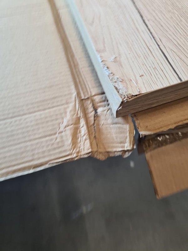 Heeft op 1 hoek schade. Als je deze kant onder houdt heb je hier geen last van (of als je hem inkort zouden wij dat aan die kant doen)